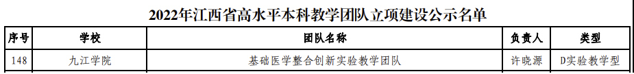 近日,从江西省教育厅网站获悉,根据《关于开展2022年江西省高水平本科教学团队的通知》,经学校申报、专家评审、省教育厅审核批准,确定我院”基础医学整合创新实验教学团队“为2022年江西省高水平本科教学团队建设点,团队负责人:许晓源教授。