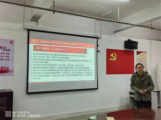 集中学习会后,许晓源以《奋进新时代 建功新九医——学习贯彻党的二十大精神》为题为读书班上了专题党课,他从党的二十大的概况和重大意义,新时代十年的伟大变革和历史性成就、新时代新征程中国共产党的使命任务、新时代新征程的重要部署和战略举措以及建功新九医,融入学校建设应用型大学的建设目标五个方面进行了深刻解读,并对深化主题教育,大兴调查研究提出了明确要求。