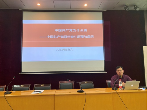 学习会上,赵文博士以《中国共产党为什么能——中国共产党百年奋斗历程与启示》为题,通俗易懂深入浅出地介绍了“为何要学习党史”、“中共党史中若干重大问题回顾”、“百年党史学习的主要启示”等三部分内容,使全院教师深受教育。