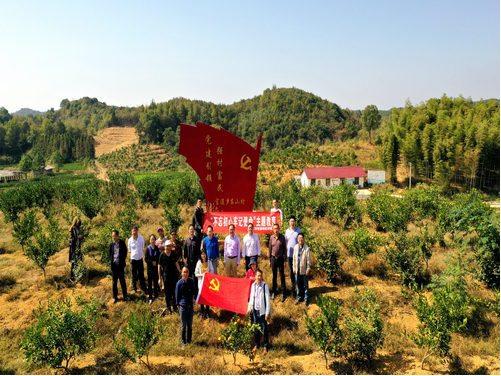 党课结束后,全体党员参观了党员示范“苗木油茶”基地,在山头雕塑的党旗上写着“党建引领,强村富民;绿色扶贫,苗木油茶”,苗木在西海水域的滋润下郁郁葱葱,桔树上结满了金灿灿的桔子,整个东山村一派欣欣向荣的景象。党员们随后参观了村有机蔬菜基地,大家得知这是村里的扶贫产业后,纷纷购买了基地的各种绿色有机蔬菜,为东山村的扶贫事业贡献了一份自己的力量。