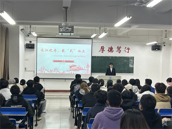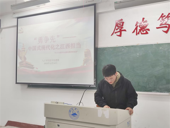 修天宇、申妍、谢志远、刘旭辉、黄宇昕、陈琦琪等宣讲员结合实际学习生活经历,为同学们从中国式现代化之江西担当、构建江西现代化产业体系、以九江为例从长江文化中读懂中国式现代化、共建绿色江西生态文明高地四个方面传达学习了习近平总书记考察江西的重要讲话精神。习近平总书记的讲话鼓励广大青年必须挺膺担当,以更加自信自强的精神姿态保护好、传承好长江文化,用年轻的声音讲好长江故事,擦亮中华文化名片,助力长江之舟劈波斩浪,推动中国式现代化行稳致远。
