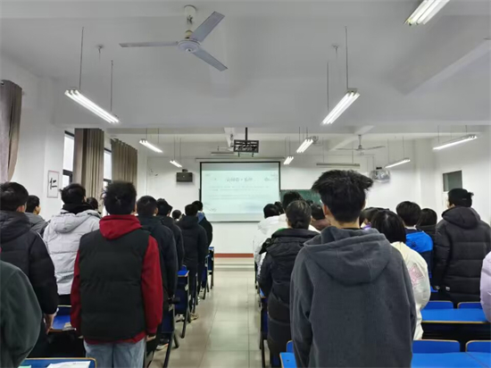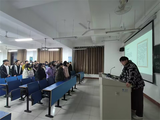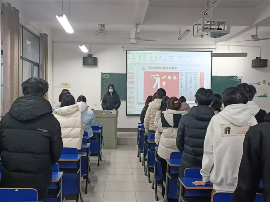 在香远楼602,A2241班团支书与同学们一起朗诵了《卜算子·咏梅》,并借梅花坚强不屈、不畏寒冷、对春天充满信心的风骨鼓励同学们要有威武不屈的精神和革命到底的乐观主义精神。