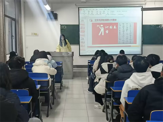 在义丰楼401,A2214班团支书给同学们展示了有关毛泽东同志所做贡献的相关视频,之后集体朗诵了《西江月·井冈山》,大家进一步感悟到了井冈山革命斗争的光辉史诗,以及毛泽东同志对此的伟大赞歌。