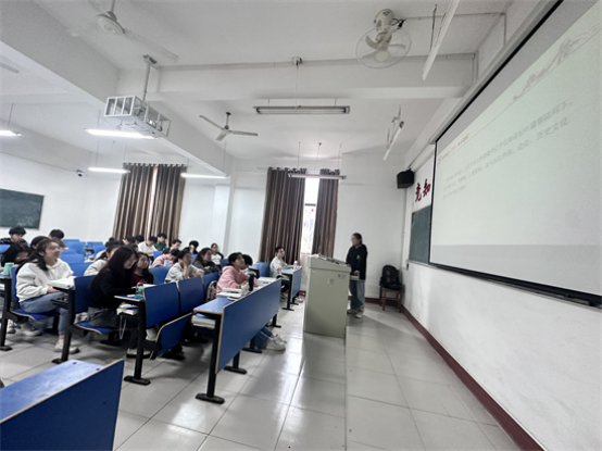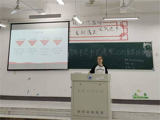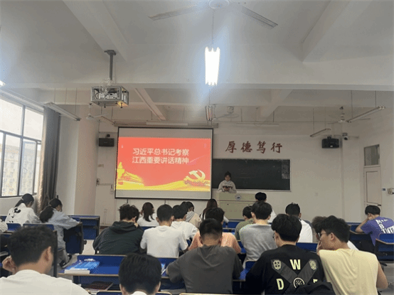 在义丰楼407,A2251班团支书向同学们讲述了习近平总书记在江西的行路历程,及此次考察后的讲话精神与对江西的期望,希望同学们深入学习贯彻习近平总书记关于推动长江经济带高质量发展的重要讲话精神,在服务和融入重大国家战略上展现江西作为。