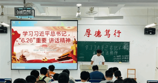 在义丰楼401,A2214班团支书首先通过一个学习习近平总书记“6.26”重要讲话精神的新闻视频引出活动主题,与同学们一起认真学习领会习近平总书记重要讲话精神,聚焦世界科技前沿、对接国家重大需求,为强国建设,民族复兴伟业作出更大贡献。