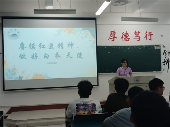 为了帮助大一新生更好地适应新环境,尽快地融入大学生活,进一步了解医务工作者的精神——红医精神,医学院深入开展新同学的心理健康教育工作。医学院学生会权益部结合专业特点,于2023年9月13日晚在义丰楼201教室为大一新生开展“赓续红医精神,做好白衣天使”主题讲座。