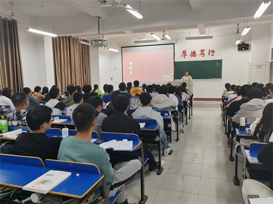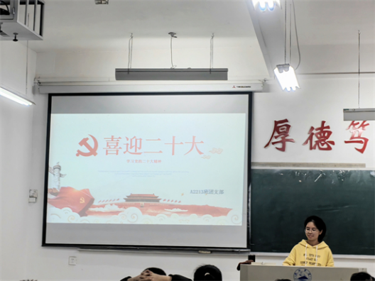 在思贤楼609,A2113班团支书以PPT的形式向同学们介绍了党的二十大报告的要点,向同学们讲述了新时代新征程中国共产党的使命任务、中国共产党过去五年的工作和新时代十年的伟大变革。最后团支书向同学们讲述要树立终身学习的观念,通过不断的学习来适应社会,以实际行动迎接党的二十大胜利召开,并且高举中国特色社会主义伟大旗帜,奋力谱写全面建设社会主义现代化国家新篇章。