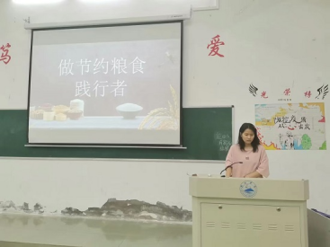 在义丰楼402教室,A2216班团支书以PPT的形式让同学们了解粮食的重要性,树立起节约粮食的意识。他指出,自古以来中华民族一向崇尚节俭,并且经常把“节俭”与“勤奋”并列为一种美德。古今中外,对国家如此,对家庭和个人也是如此,因此每个公民都有责任发扬节俭的精神品质,共同维护勤俭节约的良好社会风气。之后,同学们在齐唱团歌中,进一步加强了团员意识。