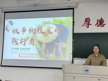 在华文楼203教室,A2014班团支书利用PPT带领同学们认知节约粮食的必要性和如何节约粮食。通过了解全球粮食现状的数据,同学们深刻地感受到节约粮食的刻不容缓。接着,同学们了解了“中国农民丰收节”的渊源,明白到勤俭节约是中华民族的传统美德。