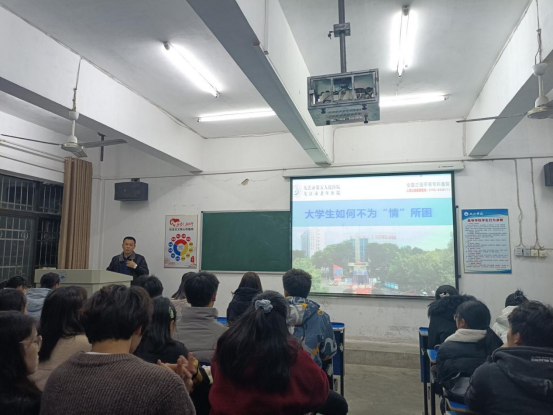 接着,黄少南主任讲述“大学生如何不为‘情’所困”内容。黄主任通过一些名人名言,介绍了情绪的重要性,更是举出不少生动形象又有趣的例子来指出中心要点——认知,它决定了人的情绪。黄主任利用网络上的真实例子进行对比,反应出不同的人,面对相同的事时,所产生的不同的心理。