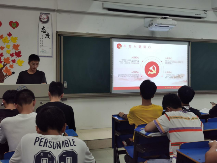 在华文楼201,A2014班团支书围绕“不忘入党初心”介绍了自己入党的初心和积极入党的原因。只有中国共产党,才能带领中国人民走上正确的发展道路,带领中国人民实现中华民族伟大复兴。之后同学们阅读了“传承红色基因”和“牢记初心使命”选文,并由入党积极分子朗读“复兴强国引路”部分内容。活动最后,全班起立庄严宣誓了“请党放心,强国有我”。
