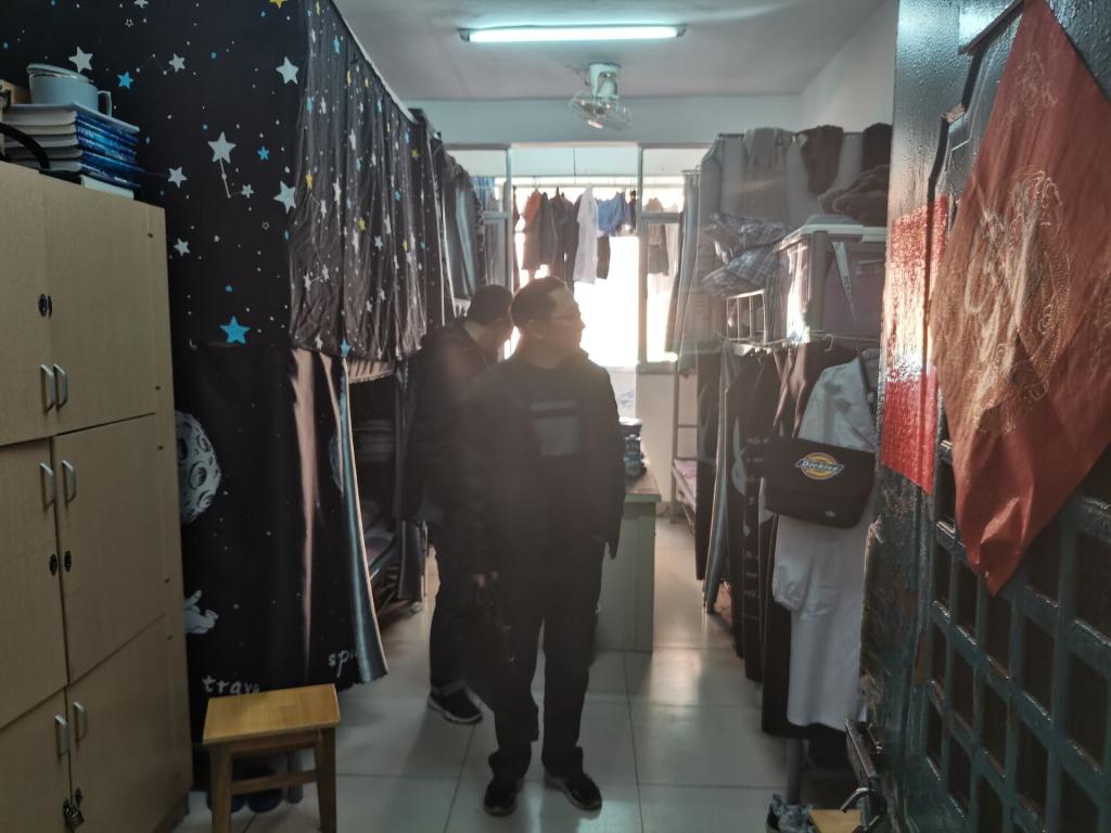 许晓源书记在辅导员和学生干部的陪同下,走进一间间学生寝室,仔细询问同学们的生活情况和实际困难,并给予了生活建议。老师们在检查寝室卫生和违章电器使用情况的同时反复叮嘱同学们一定要注意消防安全、用电安全,要注意保持寝室干净整洁。最后,老师们也对在检查过程中出现的卫生问题进行了指导。