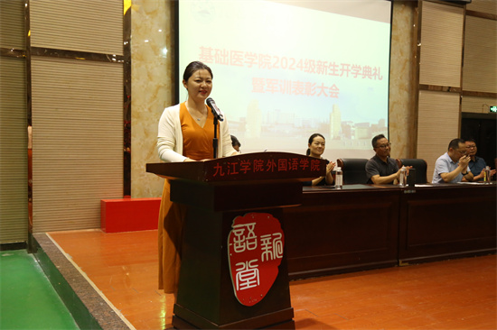 教书育人楷模刘俊老师在发言中表达了对新生的热烈欢迎,并呼吁同学们提早为自己的大学生活做出合理的规划,应当以学习为第一要务,在空余时间培养兴趣爱好,从多方面、多维度做到自我提升。她表示,全体教师定会全力以赴,为同学们的的成长保驾护航。