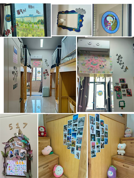 同学们发挥创意,使用各种环保材料积极参与到寝室设计中。有的寝室用小红旗点缀,彰显爱国情怀;有的寝室利用废纸折叠出好看的图案悬挂在墙壁上,既美观又环保……。在最后的评选阶段,评委们分别在寝室卫生洁净、内务整理、安全用电和美化设计四个方面进行了打分,最后有14间女寝,10间男寝在此次寝室文化节获奖。