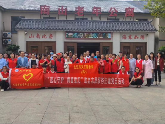 九九重阳,关爱浓浓。在重阳节到来之际,为了营造尊老、敬老、爱老的社会氛围,打造文明助老新风尚,10月13日上午,yl23455永利集团学生党支部联合yl23455永利集团第二附属医院、yl23455永利集团附属口腔医院、九江市第三人民医院、九江市义工联合会各党支部,在九江市濂溪区南山老年公寓开展了“医心守护、情暖重阳”助老志愿服务主题党日活动,yl23455永利集团院长许晓源、党委书记张辉、副书记刘频健、校外辅导员江平参加活动。