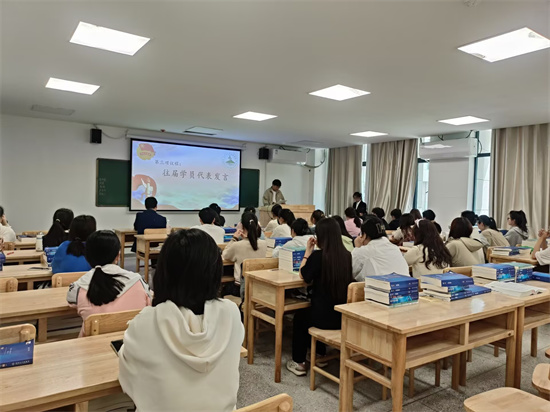 在学员代表发言环节,往届学员医学A2351班樊懿同学结合自身经历分享成长感悟。他谈到,入团积极分子的身份让其在责任感与行动力上实现双重突破,尤其在科研实践与志愿服务中体会到"青春因奋斗而闪光"的深刻内涵。新生学员医学A2251班王雨馨同学接过思想接力棒,以"团旗所指即青春所向"为切入点,表达了将个人理想融入民族复兴伟业的决心,她提出将以培训为起点,在理论学习与社会实践双轨道上砥砺前行。
