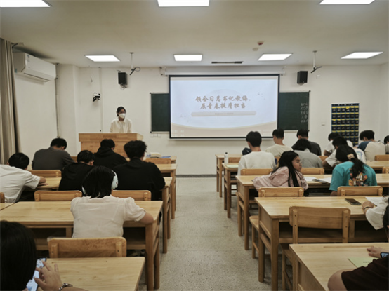 在研究生楼332,医学A2341班团支书彭瑾昱借助PPT带领同学们了解了谢依特小学戍边支教志愿者群体,深入领会他们为边疆教育事业奉献青春热血的坚守精神,让同学们对青年担当有了更直观而深刻的理解。