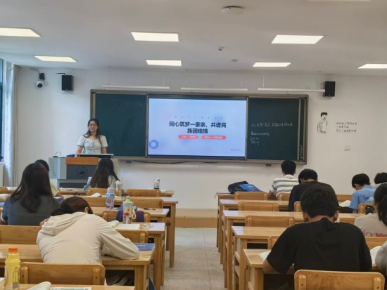 在研究生楼331,A2343班团支书廖宝睿以“石榴籽紧紧相拥”的比喻为切入点,借助PPT,为同学们系统回顾了中华民族从古代交融共处、近代共御外敌到新时代共同发展的光辉历程。他指出,“民族团结不只是一种理念,更应体现为实实在在的行动”,呼吁大家在实验研究、临床实践与社会服务中主动传递团结、协作、尊重的价值观。