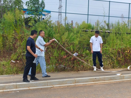 随后,老师们详细介绍了灭火器的使用方法,并通过“一提、二拔、三握、四压”的口诀帮助学生记忆。现场还让学生重复操作步骤,确保每位新生都能熟练掌握。“实战环节’中新生们则亲自使用灭火器扑灭模拟火源,体验了从判断火情到实际灭火的全过程。这一过程有效增强了他们在面对火灾时的应变能力和实战信心。此外,老师们还演示了消防栓的使用方法,指导学生在遇到较大火情时如何正确展开水带、连接管口并进行有效扑救,同时强调:“小火要用灭火器,大火要用消防栓”,不同的火情需要采取不同的应对策略。