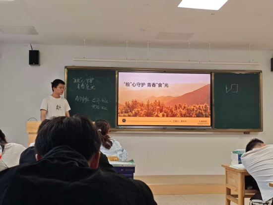 在研究生楼432教室,基础A2511班团支书熊旭宇围绕粮食安全的责任、行动与守护三大主题展开讲解。通过真实的数据和案例,他阐明了粮食安全作为国家安全基石的重要性,并分析了全球气候变化、资源紧张的严峻形势。同时,熊旭宇特别强调,每个同学都必须警惕校园餐饮浪费的累积效应,要从自身、每一餐做起,养成节约习惯。