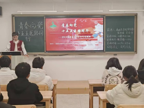 宣讲团首站走进研究生楼431教室,学生党员张新叶面向医学A2361班进行全会精神宣讲。她结合大学生创新创业、“三下乡”社会实践、校园义诊等真实活动案例,展示了九医学子服务社会的成果,并围绕“有理想、敢担当、能吃苦、肯奋斗”的思想纲要,激励同学们要坚定信念、锤炼自身能力,为“十五五”时期的现代化建设贡献蓬勃的青春力量。