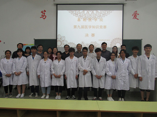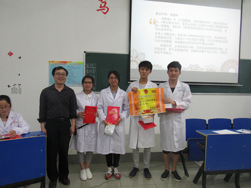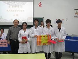 | 为了强化同学们的专业知识,增强同学们的对医学学习兴趣,5月18日晚,yl23455永利集团于华阶二举行第九届医学知识竞赛决赛。yl23455永利集团院长车向新,党委书记余朝阳,副院长郑美蓉,院办主任李美秀,特邀嘉宾解剖教研室主任傅文学,以及全体辅导员、班主任到场观看本次比赛。    经过初赛、半决赛的激烈角逐,三支代表队进入最终决赛。此次比赛共五个环节:你问我答,争分夺秒,心有灵犀,各抒己见以及最后的终极PK环节。在前两个环节中,充分体现了选手们丰厚的知识积累和临场的变通能力;心有灵犀环节考验的是团队之间的合作与默契,而最后的两个环节考验的则是选手们的语言组织能力和风险承受能力。  竞赛中,各代表队选手思维敏捷,知识运用娴熟,回答问题镇定自若。比赛一开始就显示出各队的实力,经过前两轮环节比赛,场上比分难分高下,台下观众也看得兴致昂然,整个比赛过程紧张不失活泼,赢得现场一波又一波热烈的掌声。  解剖教研室主任傅文学老师针对各抒己见环节各代表队对医患关系的陈述作了精彩点评。他赞扬了作为一名医生的伟大与奉献,并呼吁我们通过友好的沟通去舒缓当今紧张的医患关系。  随后,车向新院长作总结性讲话。他首先肯定了本次比赛的创新环节——各抒己见中的视频环节,通过视频让我们学习到了作为一名医生的奉献精神和责任感。其次,他说,医学应该是一个较为广博的专业,他建议比赛的题目内容视野可以更加开阔一些,同时,他也对组织医学知识竞赛辛苦付出的老师和同学表示了感谢。     经过紧张激烈的角逐,B1513班代表队获得冠军,A1572班代表队获得亚军,B1511班代表队获得季军。院领导为获奖队伍一一颁奖,并合影留恋。 |