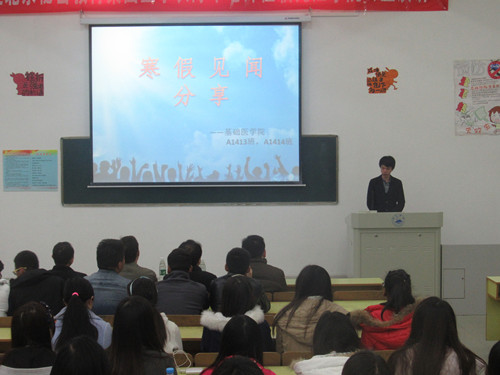 会上,同学们踊跃上台介绍寒假见闻,将自己对动漫的兴趣爱好融入生活的范露同学,向大家讲述了自己在寒假的美工成长史,展示了大圣归来的视频剪辑、海报、贴吧美图,分享了自己的制作过程和努力成果,征服了大家的眼睛;也有从特产美食、风景圣地引入并介绍自己家乡的,讲述了自己的所见所闻和自己参加夜游龙灯会的经历,并对家乡的环保意识的提高感到欣慰;还有参加河北集训的云南姑娘,她给大家分享了自己的感触,她赞美那里的学习氛围,欣赏那里互帮互助的情谊,从做人做事上,向大家讲述了一个个哲理,并希望在新的一年里自己能有所进步。