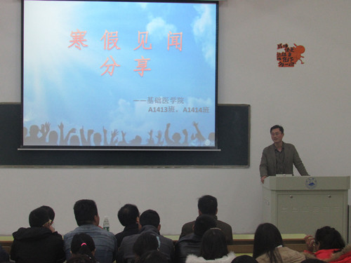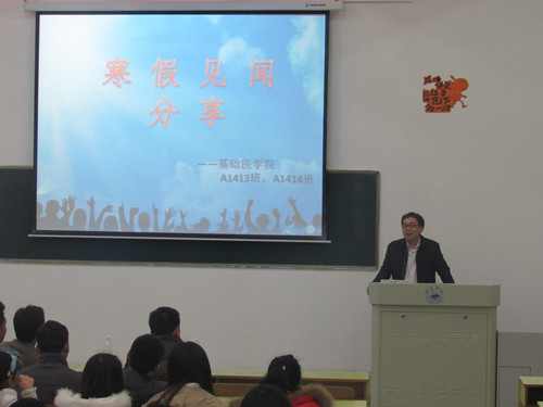 为了解同学们寒假的生活状况,感悟生活真谛,228日晚,yl23455永利集团于华阶三举行寒假见闻分享讲坛,yl23455永利集团党委书记余朝阳,学生科、团委负责人、班主任以及A1413A1414的同学们参加此次见闻分享会。