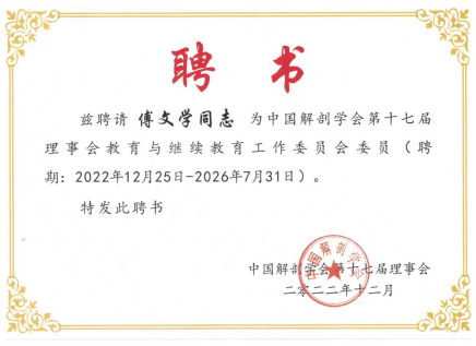 2023 年4月 26日至 29 日,中国解剖学会第十七届教育与继续教育工作委员会第一次全体委员会议在无锡召开,会议由中国解剖学会教育与继续教育工作委员会主办,江南大学承办。来自全国50余所院校的80余位代表参加了会议。我院党委委员兼人体解剖学教研室主任傅文学副教授参加会议并被聘任为第十七届教育与继续教育工作委员会委员。