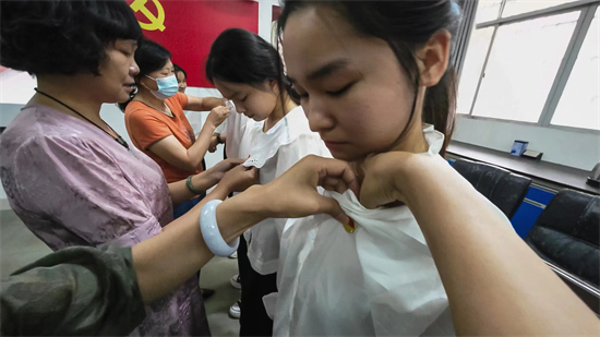 之后,老党员为新党员佩戴神圣的党徽。此举彰显了党的伟大事业代代相传,同时传递党的责任和担当精神,鞭策新党员不忘初心、牢记使命,激励大家要不断增强党员意识,充分发挥党员的先锋模范作用,自觉履行党员义务。