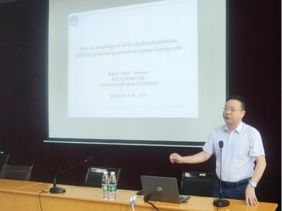 陈加祥教授讲座题目是“自噬在DEHP诱导小鼠睾丸间质细胞凋亡中的作用及机制”。陈加祥教授分别从动物和细胞实验并结合分子生物学等手段,阐述了p53/ARTS信号通路在增塑剂DEHP抑制精子发生的作用及其机理,并明确了自噬在其中的作用。陈加祥教授还与医学院院领导和老师们就医学教学、科研工作做了深入交流。陈加祥教授深厚的学识和精彩的讲授,让老师们深受启发,对促进学院今后教学和科研工作具有积极的意义和作用。