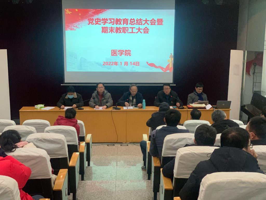 元月14日,医学院在浔东校区立本楼报告厅召开党史学习教育总结暨期末教职工大会,学院党政班子成员及全体教职工参加会议。会议由学院党委副书记刘频健主持。