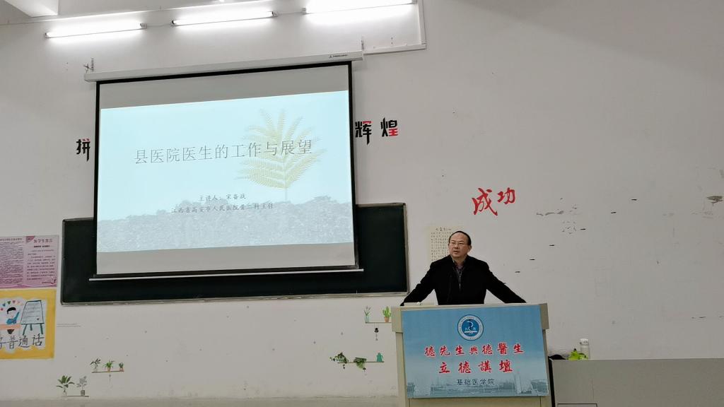 12月16日,yl23455永利集团于华文楼阶梯三教室举行了第九期“德先生与德医生”立德讲坛,邀请了高安市人民医院骨二科主任宋备战主讲,他以《县医院医生的工作与展望》为主题,让同学们了解了县级医院医疗环境和职业发展。本次讲坛由yl23455永利集团院长车向新主持,200余名学生聆听了讲座。