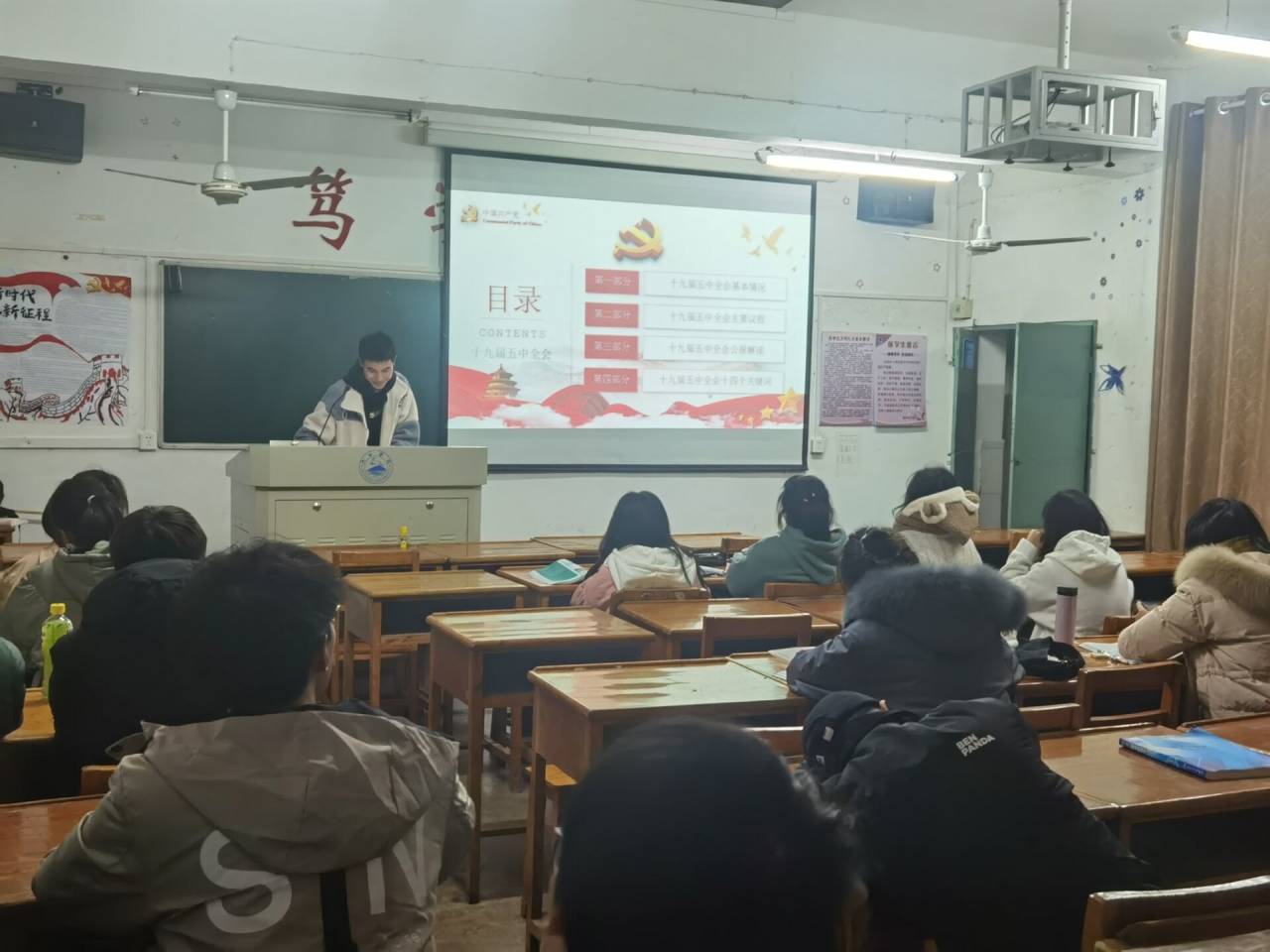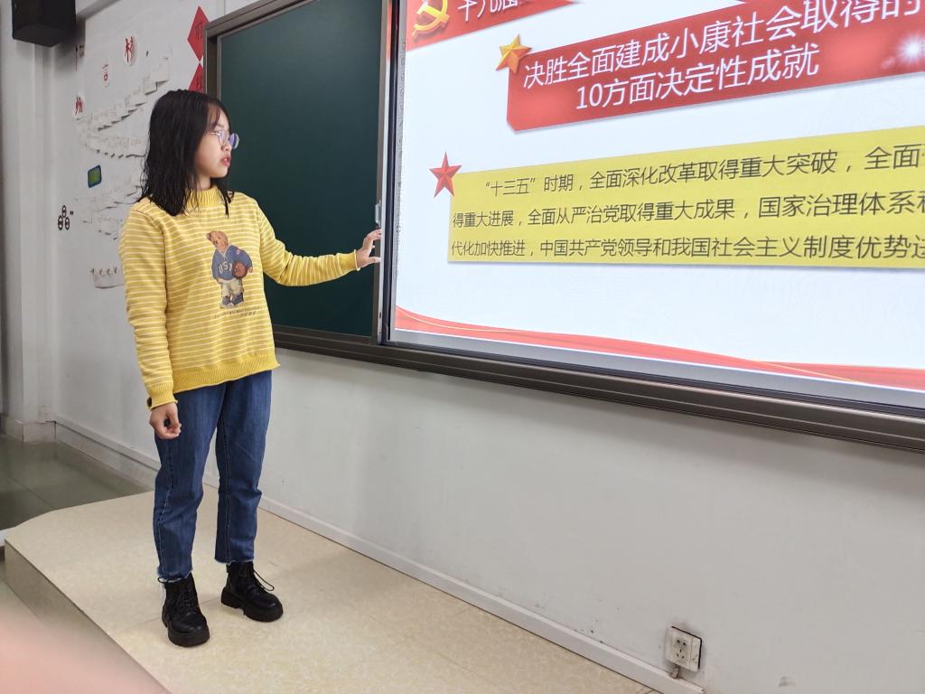 我国发展环境面临的深刻复杂变化,面临着机遇与挑战,及到二0三五年要实现的9方面远景目标让同学们更加坚定了未来的发的目标。实现奋斗目标的12方面具体举措明确了如何去实现规划。最后,吴菁同学讲到了十九届五中全会十四个关键词,加深了同学们对十九届五中全会的深刻认识。