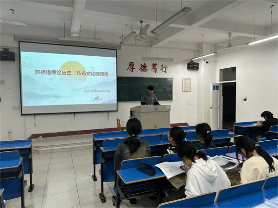 义丰楼402播放了一段清明节介绍视频。A2215班的同学们在团支书的带领下以这种轻松的方式来更深刻的了解清明节。后团支书讲述了一位位无私奉献的历史人物的故事,呼吁同学们学习先烈的优秀品质,发扬先烈们的奉献精神。