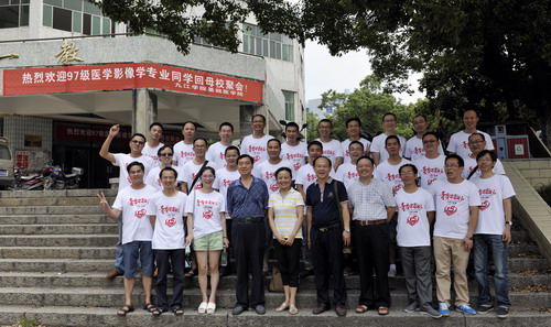 从附属医院的大门到新建的门诊部,从久违的宿舍到在修的教室,从熟悉的篮球场到办公楼,带着好奇,一路感受着惊喜,努力搜寻着每一个属于我们的那些记忆。在一教楼前,跃入眼帘的是yl23455永利集团“热烈欢迎97级医学影像学专业同学回母校聚会”红底白字,我们很多同学的眼睛湿润了,十五年前,这里是他们毕业照的背景,曾经共同的根,拥有太多共同而美好的记忆,而如今,十五年后,大家又在楼前合影留念。