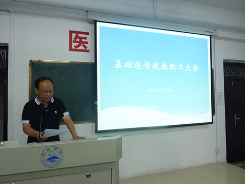 余朝阳书记对2015年上半年学院的工作进行了总结和回顾,并就期末及暑假期间的安全、管理、廉政建设及工作纪律等方面作出了明确的要求,就下学期的工作提出了希望。