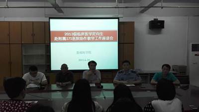 2015年6月24日晚,根据yl23455永利集团决定在附属171医院安排临床医学协作教学的精神,yl23455永利集团召开了2013级临床医学定向生赴附属171医院协作教学工作通报会和全体学生座谈会。yl23455永利集团院长车向新教授、党委书记余朝阳参加座谈会。