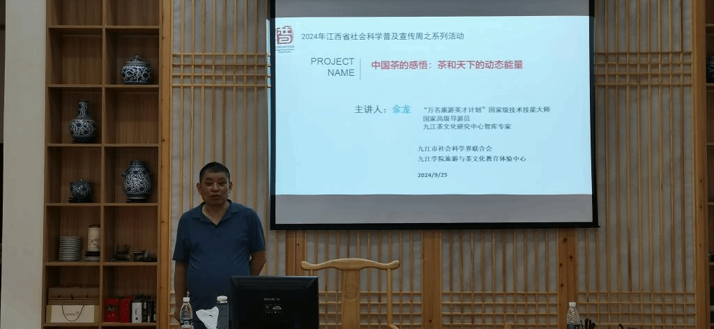 在喜迎中华人民共和国成立75周年之际,为了让更多学生了解中国茶的悠久历史和深厚文化,感悟新中国成立以来中国茶的经济、社会和文化价值,特别是茶在构建和谐社会与和平世界的独特价值,9月25日晚上,学院邀请九江市茶文化专家余龙老师在茶艺实训室举办了“中国茶的感悟:茶和天下的动态能量”专题讲座。讲座由学院党委书记张辉主持,2024级预防医学专业部分学生参加了讲座。