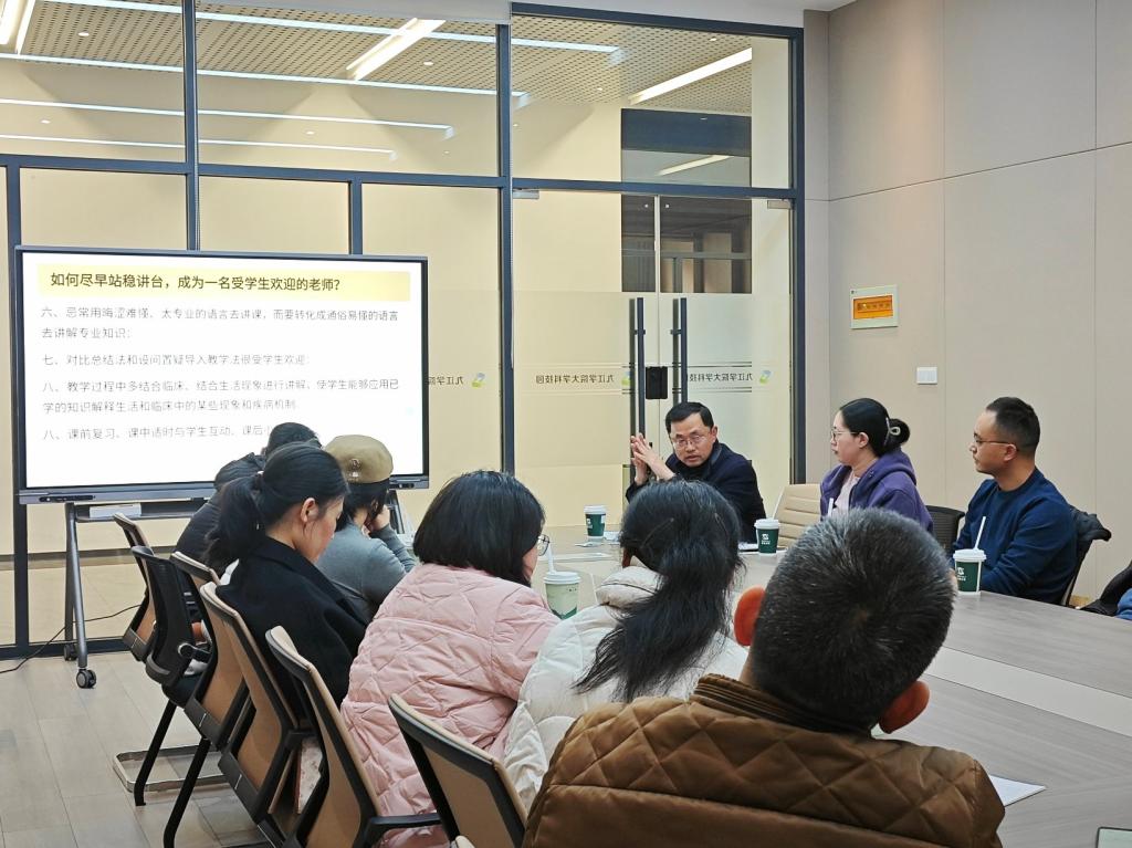 此次活动中何巍老师为大家分享了他从教32年来的亲身感受和心得体会。 他先以学生对他的课堂评教开始,引申出学生心目中的好老师是什么样的,以此展开作为一名教师应该如何上好一堂课。随后何巍老师结合自身的从教经历与感受与各位年轻老师分享了如何尽早站稳讲台,如何成为一名受学生欢迎的老师的经验与感悟。最后抛出了如何做好线上线下教学改革与创新的问题供大家探讨、交流。分享结束后,何巍老师与各位参会老师展开了深入的教学讨论与交流。