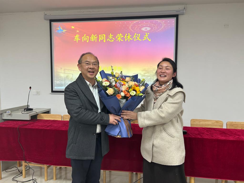 随后,学院党委书记张辉为退休教师车向新颁发荣休纪念牌,教师代表向恩师献上花束。