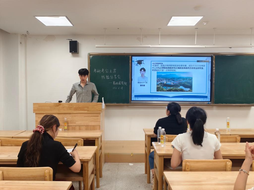 随后2025届毕业生黎世豪同学分享了自己考取本校第一届研究生的宝贵经验,从备考的点滴细节到心态的微妙把控,为学弟学妹们倾囊相授,现场气氛热烈,互动频繁。