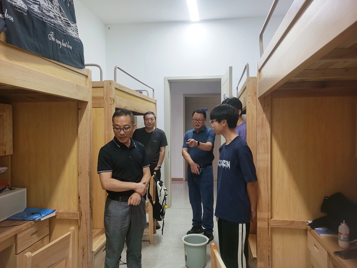 排查过程中,张辉一行细致检查了宿舍水电设施、门窗安全及消防通道情况,并就发现的问题现场提出整改意见。张辉还亲切询问了同学们的期末考试安排和暑假计划,叮嘱大家离校前务必关闭水电、锁好门窗,严格落实安全防范措施。他强调,假期期间要进一步提高反诈防骗意识,确保人身财产安全。