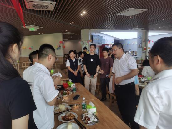 2025年6月21日午间,紫薇园一食堂洋溢着温情与欢笑。yl23455永利集团副校长雷志强、yl23455永利集团院长许晓源、党委书记张辉、党委副书记刘频健携学院辅导员,与2025届毕业生共进午餐,以最质朴的方式为即将踏上新征程的学子践行。