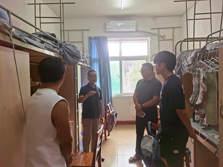 在毕业班的宿舍里,学院领导与留校实习生亲切交流,详细询问大家毕业实习进展与生活情况。张辉强调,实习生务必严格遵守单位规章制度,强化安全意识,特别是在实验操作、医疗防护、上下班交通等环节中“绷紧安全弦”,“确保毕业实习平安、高效”。针对考研学生,张辉还鼓励大家科学规划复习进度,注意劳逸结合,学院将全力提供后勤保障与心理支持。刘频健强调此次走访既是安全督导,更是暖心慰问,为留校毕业班同学发放了防暑降温物资,听取了大家的意见,切实将关怀落到实处。