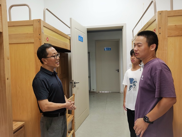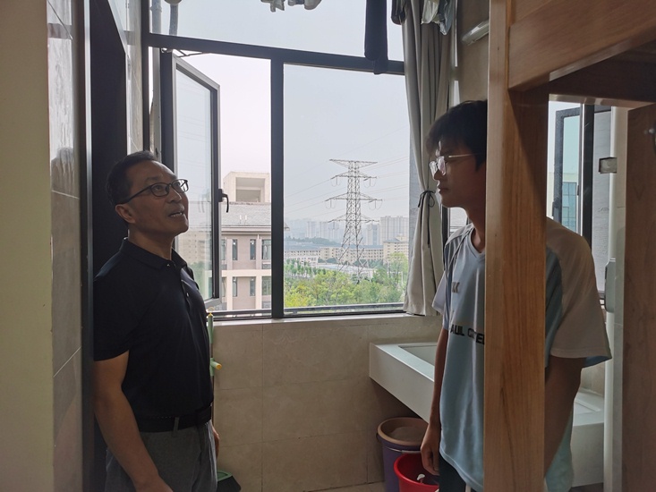 每到一个寝室,张辉、刘频健就会与同学们进行亲切友好的交流与沟通,气氛融洽。张辉详细了解了同学们的假期安排、出行计划以及学习生活近况,并代表学院向同学们致以节日的问候。同时,他勉励留校同学要合理安排作息,利用假期时间充实自我。