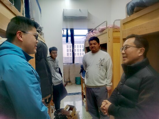 此次检查不仅是一次常规的隐患排查,更是一次生动的安全教育实践。张辉一行仔细查看了宿舍楼道的消防器材维护情况,并走进学生寝室,重点关注用电规范。每到一处,张辉都与同学们亲切交谈:“家是哪里的?返程路上还顺利吗?”“今天要好好休息,明天以饱满的精神状态上课”。在了解学生返校情况的同时,他也化身“安全宣讲员”,向同学们讲解违规用电可能带来的严重后果。他叮嘱大家,安全无小事,要做到“人走电断”,从源头上杜绝安全隐患。